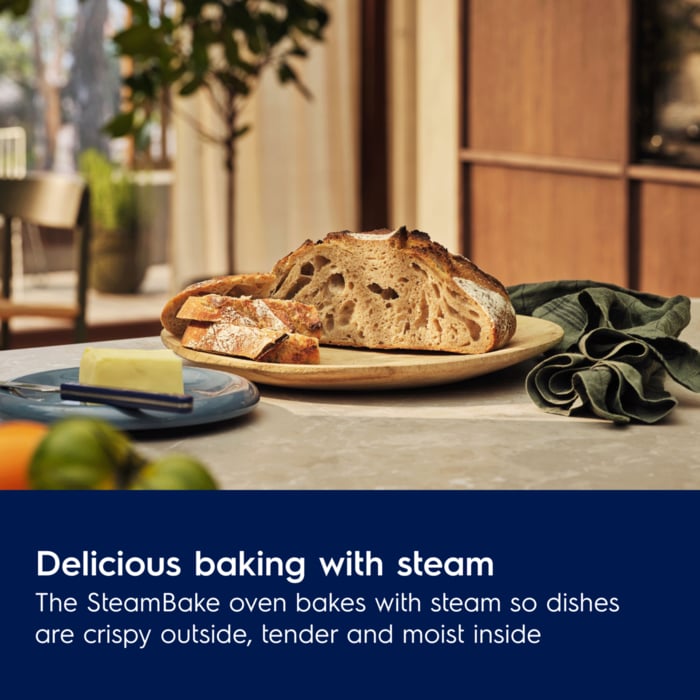 The SteamBake multifunction oven uses steam for delicious baking. Dishes are golden-crispy outside while the inside remains tender and moist. Baking with steam also gives you food that is evenly cooked in every corner.