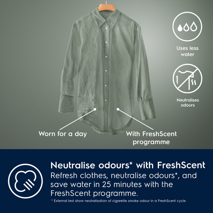 Refresh clothes and neutralise odours* with the FreshScent programme