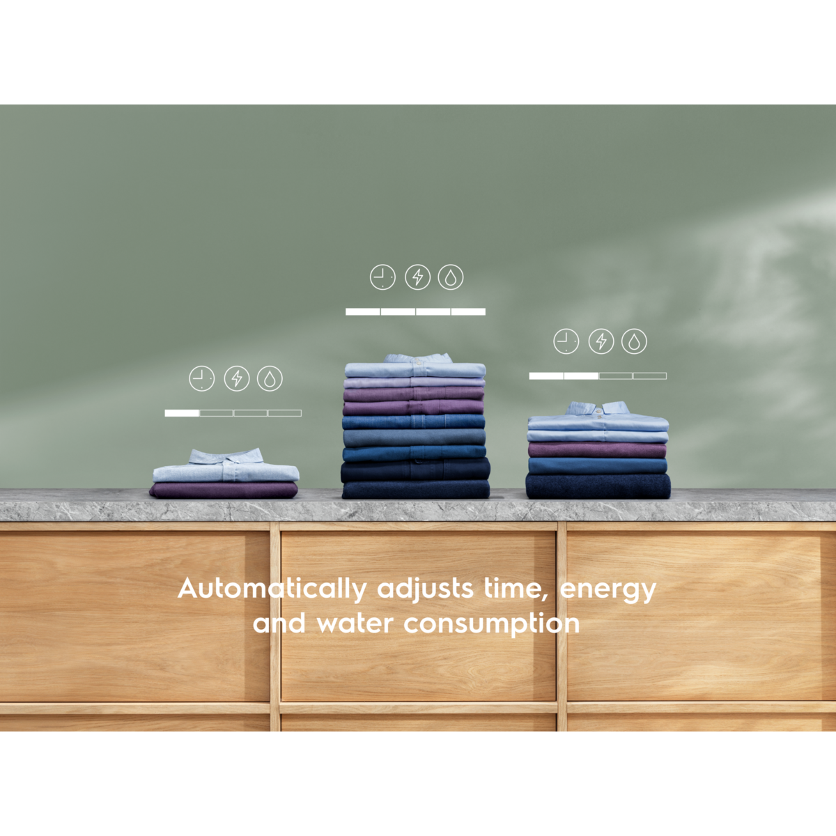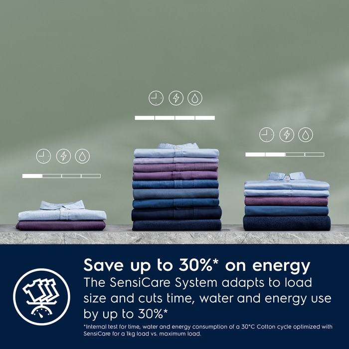 *Internal test for time, water and energy consumption of a 30°C Cotton cycle optimized with SensiCare for a 1kg load vs. maximum load.